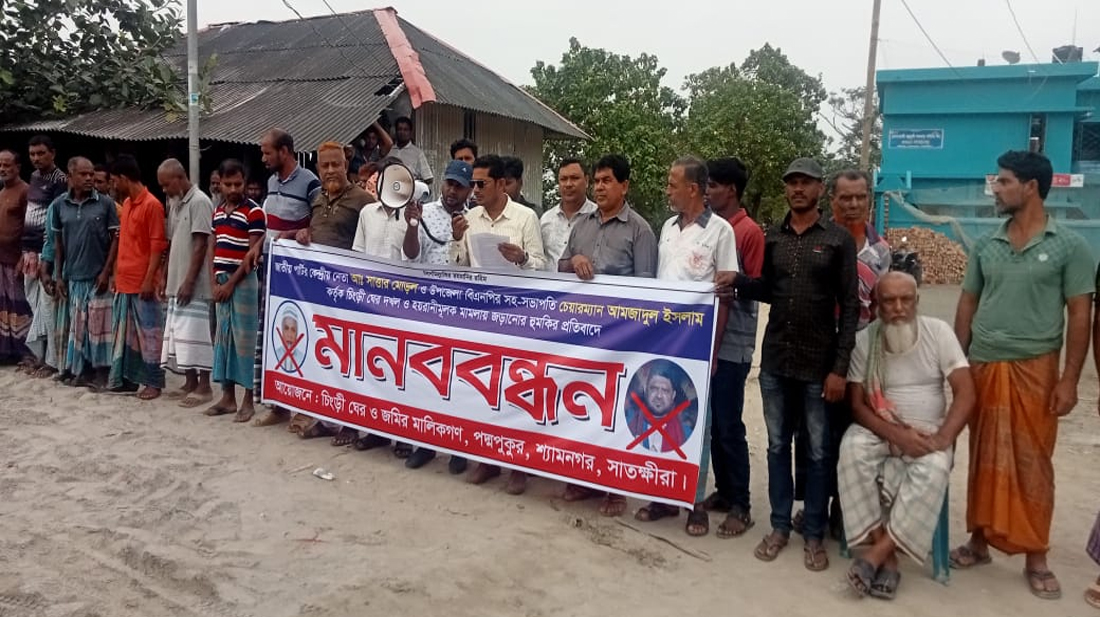 চিংড়ী ঘের দখল ও হয়রানি মূলক মামলায় জড়ানোর প্রতিবাদে শ্যামনগরে মানববন্ধন