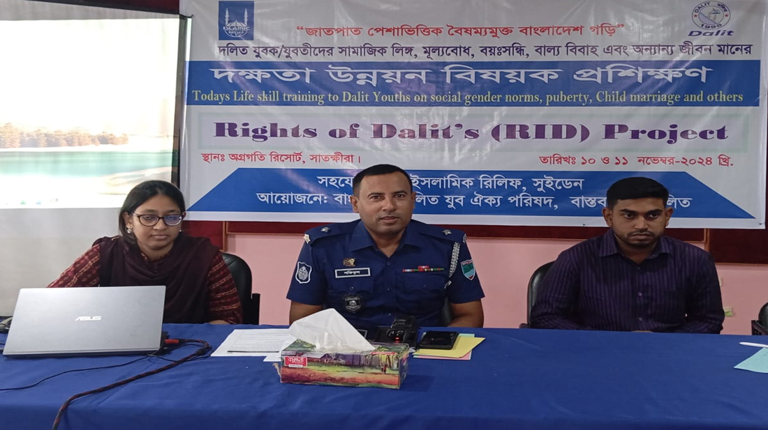 ‘জাতপাত পেশাভিত্তিক বৈষম্যমুক্ত বাংলাদেশ গড়ি’ এই স্লোগানকে সামনে রেখে আয়োজিত কর্মশালায় প্রধান অতিথি ছিলেন সাতক্ষীরা সদর থানার পুলিশ পরিদর্শক মো: শফিকুল ইসলাম। এছাড়া দক্ষতা উন্নয়নে করনীয় বিষয়ে আলোচনা করেন ‘দলিত’-এর প্রকল্প কর্মকর্তা মোসা আনজুমান আরা, প্রশিক্ষক সৈয়দ রাব্বি, মোবিলাইজার সুজন দাস ও নিকোলাস মিস্ত্রী।ড়