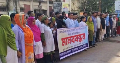 আদেশ অমান্য করে আশাশুনিতে জমি দখল, বাসা ভাংচুর ও লুটপাটের প্রতিবাদে মানববন্ধন
