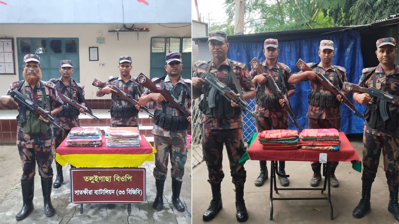 তলুইগাছা বিওপির দল কামারাবাড়ি এলাকা থেকে ৩৬,০০০ টাকার ভারতীয় শাড়ি উদ্ধার করে।