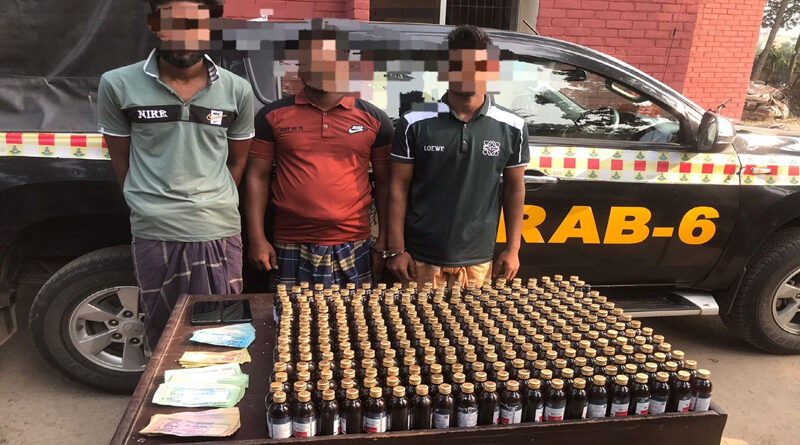 র্যাবের অভিযানে ২৯৮ বোতল উইনকেরিক্সসহ ৩ মাদক ব্যবসায়ী গ্রেপ্তার