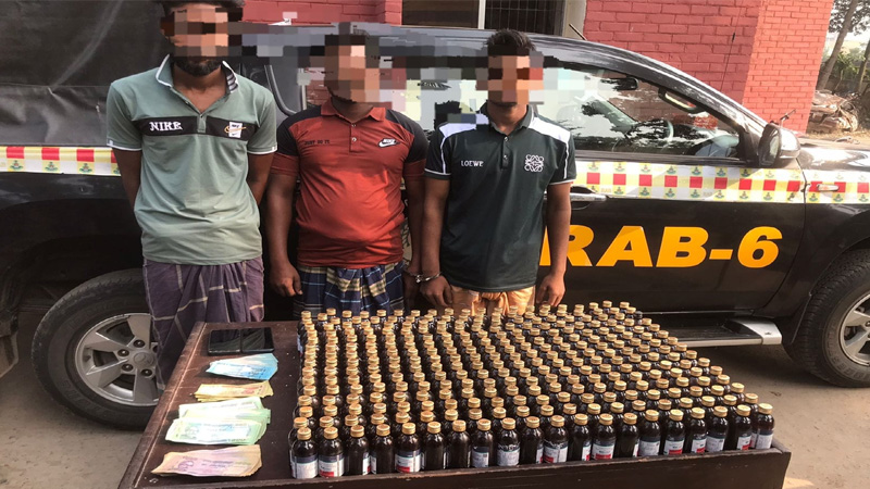 র্যাবের অভিযানে ২৯৮ বোতল উইনকেরিক্সসহ ৩ মাদক ব্যবসায়ী গ্রেপ্তার