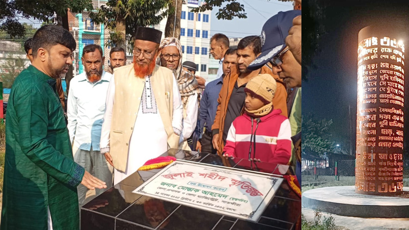 শনিবার (১৫ নভেম্বর) সকালে সাতক্ষীরার বিতর্কিত জেলা প্রশাসক মোস্তাক আহমেদ জেলা পরিষদের প্রধান নির্বাহী কর্মকর্তা মাহফুজুর রহমান, অতিরিক্ত জেলা প্রশাসক (সার্বিক) বিঞ্চুপদ পাল, জেলা জামায়াত আমীর উপাধ্যক্ষ শহিদুল ইসলাম মুকুল, শহর জামায়াতের নায়েবে আমীর মাওলানা মুস্তাফিজুর রহমানকে নিয়ে এ স্মৃতি স্তম্ভ উদ্বোধন করেন।