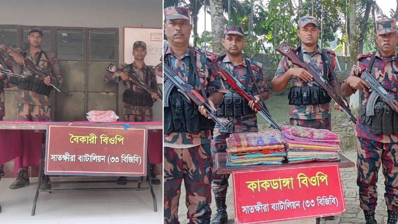 কাকডাঙ্গা বিওপির বিশেষ টহল মেইন পিলার ১৩/৩ এস এর ৫ আরবি পয়েন্টের কাছাকাছি গেড়াখালি এলাকা থেকে ৬০ হাজার টাকা মূল্যের ভারতীয় শাড়ি জব্দ করে।