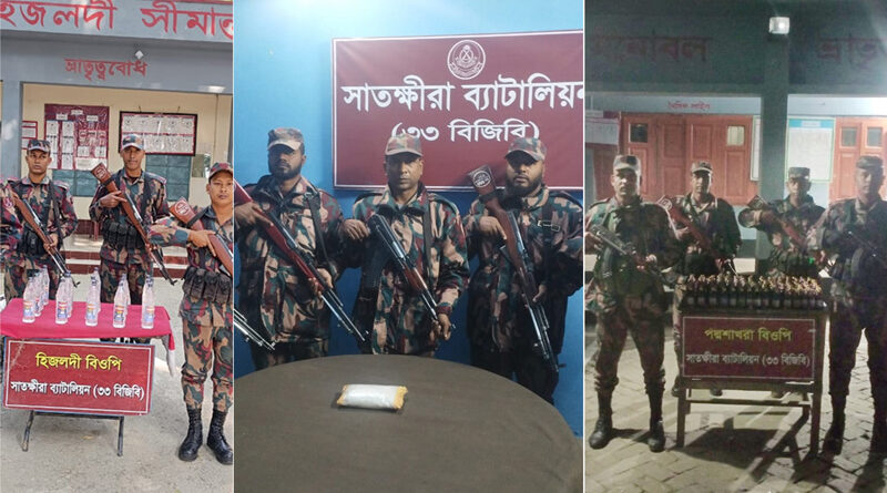 বিজিবি সূত্রে জানা যায়- হিজলদী বিওপির বিশেষ টহল দলের সদস্যরা গোপন সংবাদের ভিত্তিতে কলারোয়ার শিশুতলা আমবাগান এলাকা থেকে ২০ বোতল ভারতীয় মদ জব্দ করে। যার মূল্য ৩০ হাজার টাকা। কাকডাঙ্গা বিওপির দুটি পৃথক দলের সদস্যরা গেড়াখালী ও কেঁড়াগাছি এলাকা থেকে ৪ লাখ ৪৭ হাজার টাকা মূল্যের ভারতীয় শাড়ি ও ঔষধ আটক করে। মাদরা বিওপির সদস্যরা দক্ষিণ চান্দা এলাকা থেকে ৭০ হাজার টাকা মূল্যের ভারতীয় ঔষধ জব্দ করে। তলুইগাছা বিওপির সদস্যরা কেড়াগাছি বাঁশবাগান এলাকা থেকে ১ লাখ ৪০ হাজার টাকা মূল্যের ভারতীয় ঔষধ জব্দ করে। সদর উপজেলার ভোমরা বিওপির সদস্যরা লক্ষীদাড়ি এলাকা থেকে ৭০ হাজার টাকা মূল্যের ভারতীয় ঔষধ জব্দ করে।