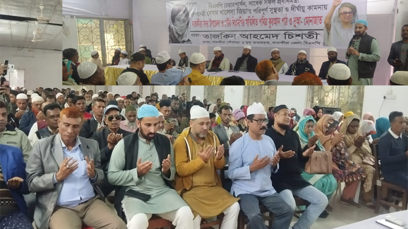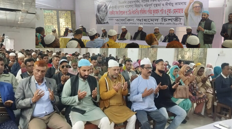 দোয়া মাহফিলে বেগম খালেদা জিয়ার দ্রুত সুস্থতা, দীর্ঘায়ু এবং দেশ-জাতির শান্তি ও কল্যাণ কামনা বিশেষ মোনাজাত পরিচালনা করেন পৌর মসজিদের ইমাম হাফেজ মাওলানা আনাস আব্দুল্লাহ।