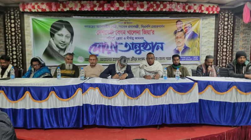 কাজী কামরুজ্জামানের সভাপতিত্বে দেশনেত্রী বেগম খালেদা জিয়ার সুস্থতা কামনা করে শহরের হোটেল টাইগার প্লাসে উক্ত দোয়া মাহফিল অনুষ্ঠিত হয়। এসময় বক্তব্য রাখেন সংগঠনের সাধারন সম্পাদক সিরাজুল ইসলাম, শহর বিএনপির সাবেক সদস্য সচীব আল মামুন রাজু।