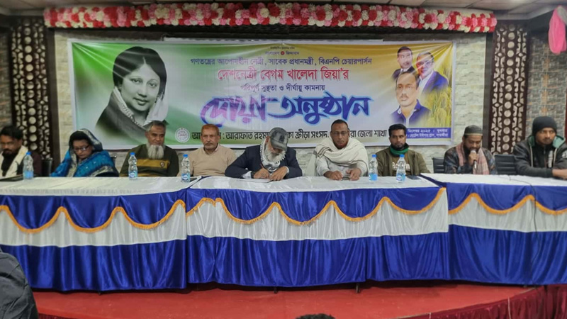 কাজী কামরুজ্জামানের সভাপতিত্বে দেশনেত্রী বেগম খালেদা জিয়ার সুস্থতা কামনা করে শহরের হোটেল টাইগার প্লাসে উক্ত দোয়া মাহফিল অনুষ্ঠিত হয়। এসময় বক্তব্য রাখেন সংগঠনের সাধারন সম্পাদক সিরাজুল ইসলাম, শহর বিএনপির সাবেক সদস্য সচীব আল মামুন রাজু।