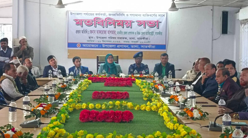 বিশেষ প্রতিনিধি, তালা: সাতক্ষীরার নবাগত জেলা প্রশাসক মিজ আফরোজা আখতার তালা উপজেলার সুধীজনদের সঙ্গে মতবিনিময় সভা করেছেন। বৃহস্পতিবার (১১ ডিসেম্বর ২০২৫) বেলা সাড়ে ১১টায় উপজেলা প্রশাসনের আয়োজনে উপজেলা পরিষদের সভাকক্ষে অনুষ্ঠিত সভায় সভাপতিত্ব করেন উপজেলা নির্বাহী কর্মকর্তা তারেক হাসান।