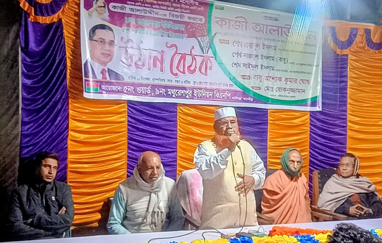 বৃহস্পতিবার (১১ডিসেম্বর-২৫) সন্ধ্যায় দেয়া ঘোষপাড়া সার্বজনীন দূর্গা মন্দির প্রাঙ্গণে অনুষ্ঠিত উঠান বৈঠক ও সমাবেশে বাবু অশোক কুমার ঘোষের সভাপতিত্ব উপজেলা কৃষকদলের আহবায়ক রোকনুজ্জামান রোকনের সার্বিক সঞ্চালনায় সভায় প্রধান অতিথির বক্তব্যে বিএনপির জাতীয় নির্বাহী কমিটির সদস্য, সাবেক এমপি এবং ধানেরশীষ প্রতীকের মনোনীত প্রার্থী আলহাজ্ব কাজী মোঃ আলাউদ্দিন বক্তব্যে বলেন -২০০১ সালের ১লা অক্টোবর জাতীয় সংসদ নির্বাচনে মনোনয়ন পেয়ে আপনাদের ভোটে আমি নির্বাচিত হয়েছিলাম। সেই নির্বাচনে আওয়ামী লীগের হেভিওয়েট প্রার্থী ডা. এ.এফ. এম. রুহুল হককে ৪২ হাজার ভোটের ব্যবধানে পরাজিত করে কালিগঞ্জ দেবহাটার ১৭টি ইউনিয়নের মানুষের সেবা করার সুযোগ পেয়েছিলাম সেটা এই এলাকাবাসী জানেন। সনাতনীরা মানে নৌকা নয়, তারা আগামী ১২ ফেব্রুয়ারি জাতীয় সংসদ নির্বাচনে ধানেরশীষ প্রতিকে ভোট দিয়ে তারা দেখিয়ে দিবে।