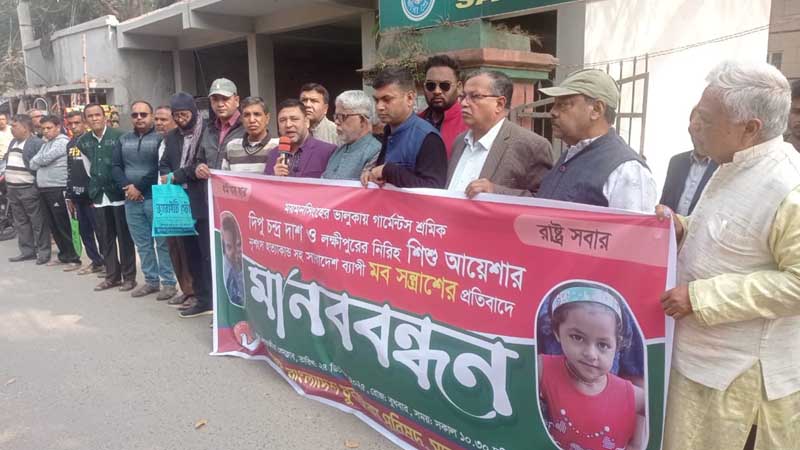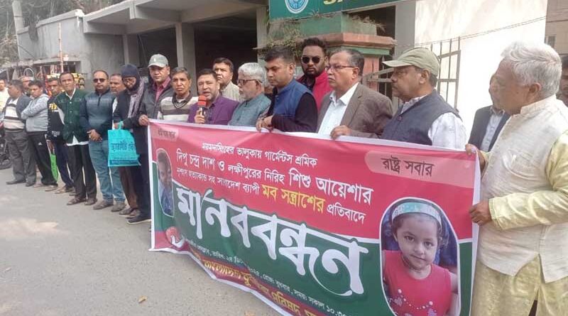 স্টাফ রিপোর্টার: পোশাক কারখানার শ্রমিক দীপু চন্দ্র দাসকে মিথ্যা ধর্ম অবমাননার দায়ে পুলিশ হেফাজত থেকে ছিনিয়ে নিয়ে নির্যাতনের পর তাকে বিবস্ত্র করে গাছে ঝুলিয়ে পুড়িয়ে হত্যা ও লক্ষীপুরের বিএনপি কর্মী বেলাল হোসেনের মেয়ে আয়েশাকে ঘরের মধ্যে পুড়িয়ে হত্যার প্রতিবাদসহ দেশব্যাপি মব ভায়োলেন্সের প্রতিবাদে সাতক্ষীরায় মানববন্ধন কর্মসুচি পালিত হয়েছে।