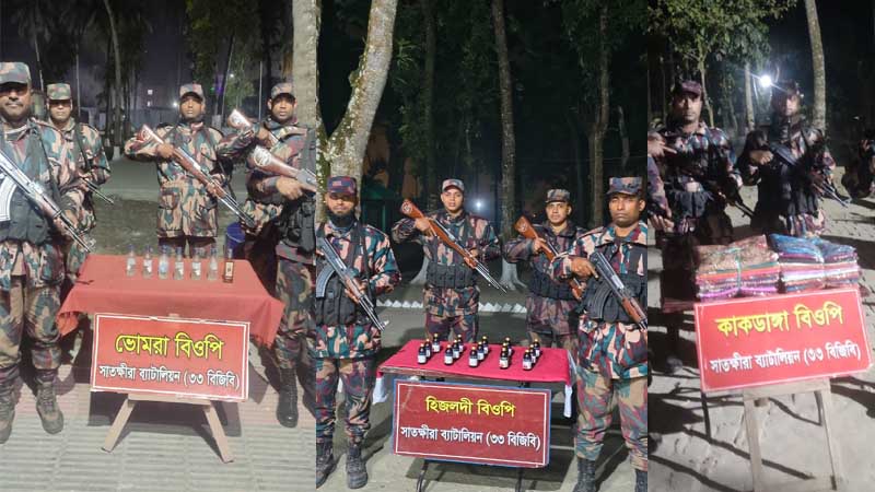 রবিবার (২৮ ডিসেম্বর ) সাতক্ষীরা ব্যাটালিয়ন (৩৩ বিজিবি) এর অধীনস্থ ভোমরা, কাকডাঙ্গা, মাদরা, হিজলদী বিওপি এবং বাঁকাল চেকপোস্টের দায়িত্বপূর্ণ এলাকায় পৃথক অভিযানে ৭ বোতল মদ, ১৫ বোতল উইনসিরাক্স সিরাপ, ভারতীয় শাড়ি, শাল ও ঔষধ জব্দ করা হয়।