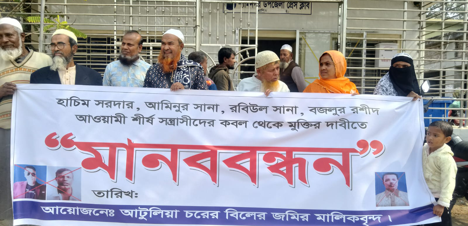 জি এম আব্দুল কাদের, শ্যামনগর: শ্যামনগরের আটুলিয়ার চরের বিল গ্রামে সন্ত্রাসীদের কবল থেকে জমি দখল পেতে জমির মালিকদের পক্ষ থেকে মানববন্ধন করা হয়েছে। ২০ জানুয়ারী (মঙ্গলবার) দুপুর সাড়ে ১২ টায় শ্যামনগর উপজেলা প্রেস ক্লাবের সামনে আটুলিয়া চরের বিলের গ্রামের জমি দখলের অপচেষ্টার বিরুদ্ধে মানববন্ধন অনুষ্ঠিত হয়।