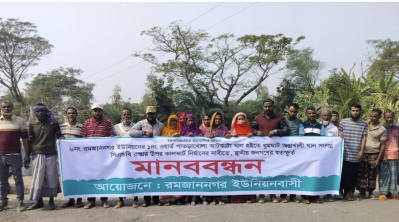 রোববার বেলা ১১টায় সাতক্ষীরা-ভেটখালী সংযোগ সড়কের পাতড়াখোলা নিলু মিস্ত্রির মোড় এলাকায় এ মানববন্ধন হয়। ‘রমজাননগর ইউনিয়নবাসী’ ব্যানারে আয়োজিত ঘণ্টাব্যাপী মানববন্ধনে পাতড়াখোলা, অন্তাখালী, ঘুমঘাট, চাঁদখালী, পাঁচশতবিঘাসহ পার্শ্ববর্তী গ্রামের তিন শতাধিক নারী-পুরুষ অংশ নেন।