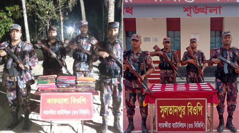 তলুইগাছা বিওপির দুটি পৃথক আভিযানিক দল সীমান্ত পিলার ১২/৩ এস এর প্রায় ৮০০ গজ এবং ৩ কিলোমিটার বাংলাদেশের অভ্যন্তরে সাতক্ষীরা সদর থানার চৌরঙ্গী ও বাঁশদহা বাজার এলাকায় অভিযান চালিয়ে প্রায় ৪ লাখ ১ হাজার টাকা মূল্যের ভারতীয় শাড়ি, ইয়াবা, একটি মোটরসাইকেল ও হেলমেট জব্দ করে।